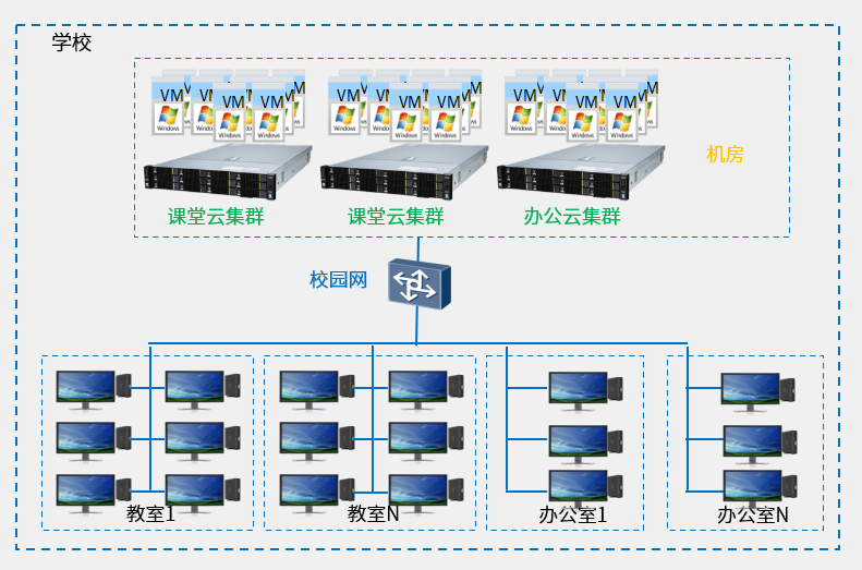 1、方案采用“云端计算”架构,将教学所需的桌面统一存放于服务器之中,通过桌面云管理软件进行管理,前端云终端只传递键鼠操作及画面等IO流,桌面数据的产生及存储都在服务器中进行,安全易运维。